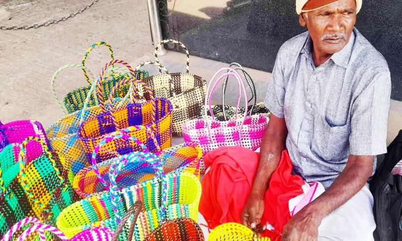 text_fieldsനെടുങ്കണ്ടം ടൗണില് നെയ്ത്തുസഞ്ചിയുമായി വഴിയോരത്ത് വില്പ്പന നടത്തുന്ന വയോധികന്