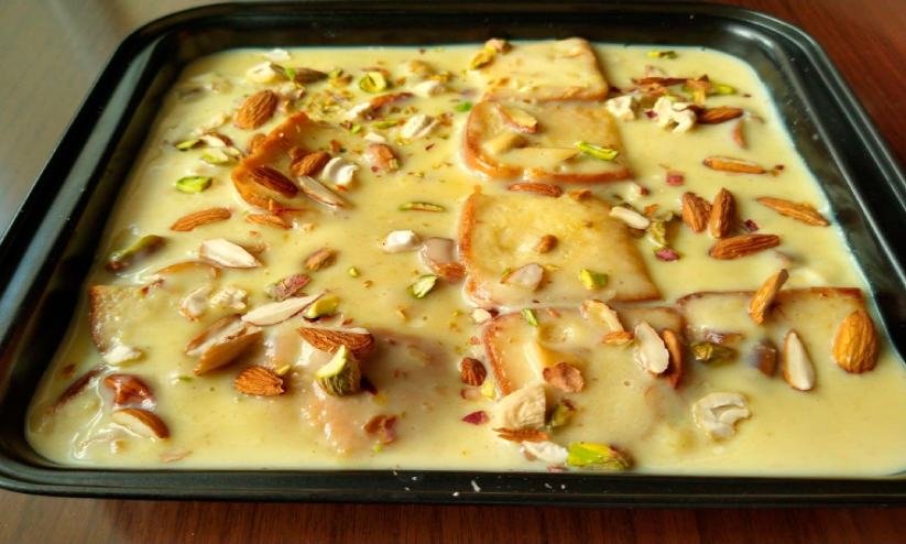 ഒരു ബേക്കിങ് ട്രേയിൽ പാൽ, പഞ്ചസാര,മുട്ട, ഏലയ്ക്കപ്പൊടി, റോസ് വാട്ടർ ചേർത്ത് സ്പൂൺ കൊണ്ട് പഞ്ചസാര അലിയുന്നത് വരെ മിക്സ് ചെയ്ത ശേഷം ബ്രഡ് നന്നായി ഡിപ്പ് ചെയ്ത് വെക്കുക. ശേഷം 180 ഡിഗ്രിയിൽ 10 മിനിറ്റ് പ്രീഹീറ്റ് ചെയ്ത ഓവനിൽ 20 മിനിറ്റ് ബേക്ക് ചെയ്ത ശേഷം ചോപ് ചെയ്ത ബദാം പിസ്ത കൊണ്ട് ഗാർണിഷ് ചെയ്ത് ചൂടോടെ സർവ് ചെയ്യാം. ഓവൻ ഇല്ലെങ്കിൽ അരമണിക്കൂർ ആവിയിൽ വേവിച്ചും തയ്യാ റാക്കാം.