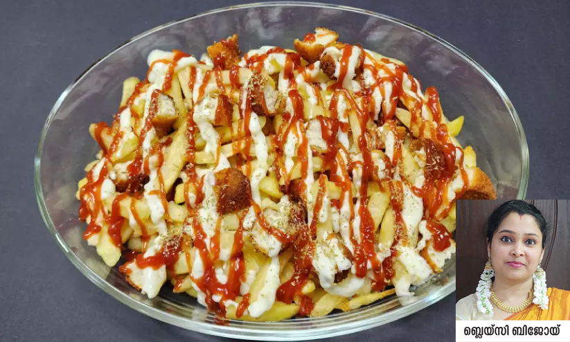 - ചൂടായ എണ്ണയിൽ ചിക്കൻ നഗെറ്റ്സും, ഫ്രഞ്ച് ഫ്രൈസും വറുത്തെടുത്ത് മാറ്റിവെക്കുക. ചിക്കൻ നഗെറ്റ്സ് മുറിച്ചു കഷണങ്ങളാക്കുക.