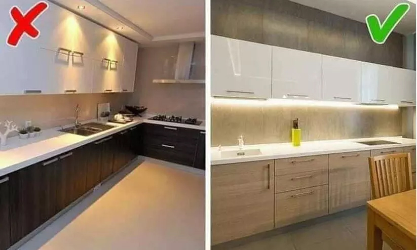കൗണ്ടർ ടോപ്പിൽ നല്ല വെളിച്ചം ലഭിക്കണം. ലൈറ്റുകൾ ഫിറ്റ് ചെയ്യുമ്പോൾ അടുക്കളയിൽ ജോലി ചെയ്യുന്നയാളുടെ നിഴൽ കൗണ്ടർ ടോപ്പിൽ വീഴാത്ത വണ്ണം ലൈറ്റ് പൊസിഷൻ പ്ലാൻ ചെയ്യുക.