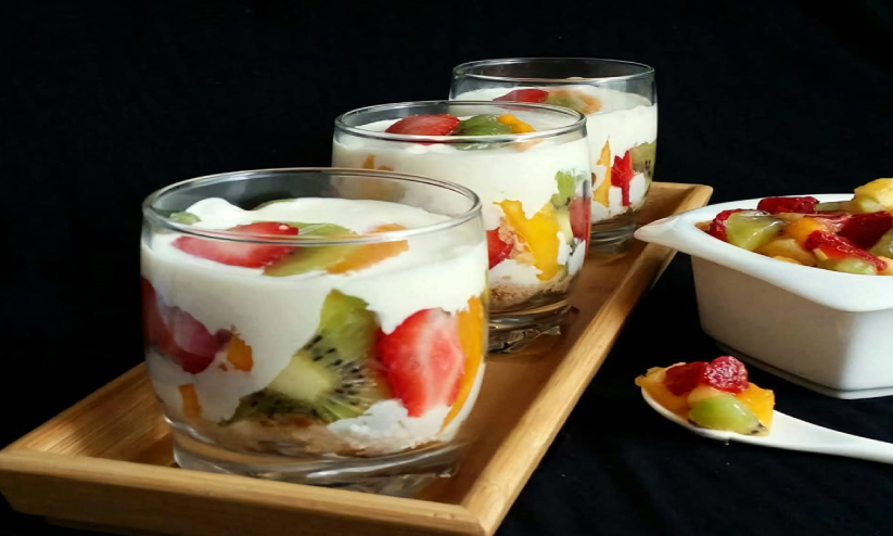 - തുടർന്ന് മുറിച്ചുവച്ച ഫ്രൂട്ട്സ് ചേർക്കുക. വീണ്ടും ക്രീം മിശ്രിതം ഒഴിച്ച് മുകളിൽ ഇഷ്ടമുള്ള രീതിയിൽ അലങ്കരിക്കുക.