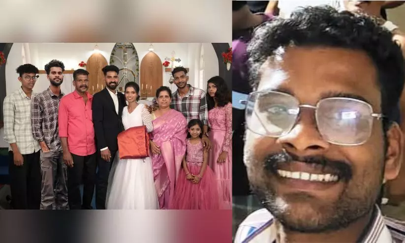 ഫോട്ടോ: 1. മൂത്ത സഹോദരൻ ജിനുവിെൻറ വിവാഹ ഫോട്ടോ, കണ്ണടധരിച്ച യുവാവ് ഒഴികെ ബാക്കിയെല്ലാരെയും ഉരുൾപൊട്ടലിൽ കാണാതായി, 2. ജിഷ്ണു രാജൻ