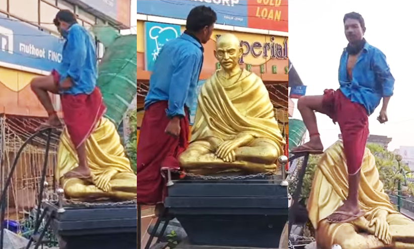 ഗാന്ധി പ്രതിമയുടെ മുഖത്തടിച്ചും അസഭ്യം പറഞ്ഞും മദ്യപാനിയുടെ പരാക്രമം; വ്യാപക പ്രതിഷേധം