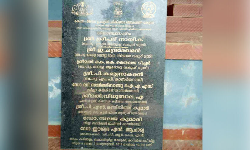 പ്രവൃത്തി ഉദ്ഘാടനം ചെയ്ത ശിലാഫലകം കിനാനൂർ കരിന്തളം പഞ്ചായത്തിലെ ഓഫിസ് മുറിയിൽ സൂക്ഷിച്ചിട്ടുണ്ട്. 2019 ഫെബ്രുവരി മൂന്നിന് കേന്ദ്ര ആയുഷ് മന്ത്രി ശ്രീപദ് നായിക്കാണ് തറക്കല്ലിടൽ ചടങ്ങ് ഉത്സവാന്തരീക്ഷത്തിൽ ഉദ്ഘാടനം ചെയ്തത്. ആരോഗ്യമന്ത്രിയായിരുന്ന കെ.കെ. ശൈലജയാണ് അധ്യക്ഷതവഹിച്ചത്.