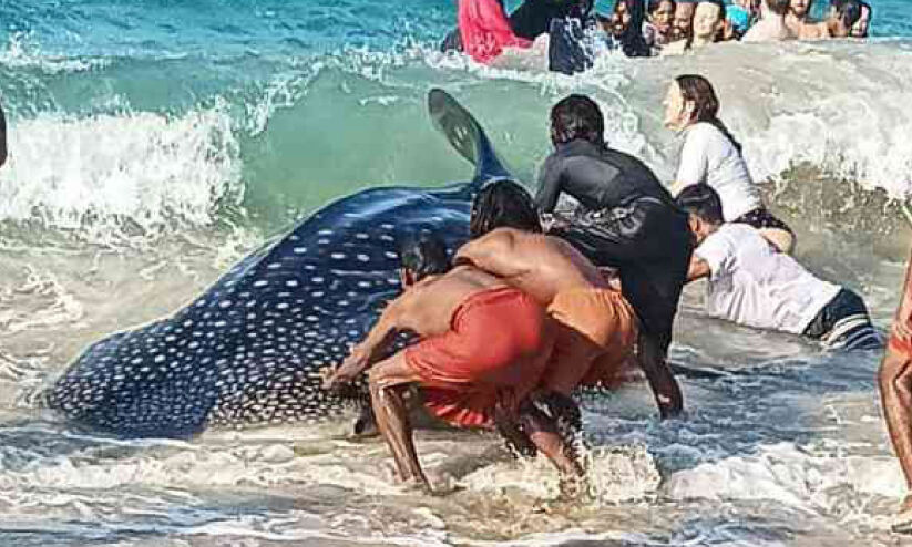 തിമിംഗലത്തെ കടലിലേക്ക് തള്ളിവിടുന്നു