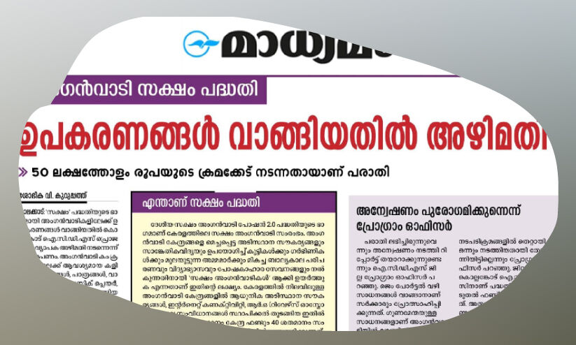 text_fieldsപാലക്കാട്: കൊല്ലങ്കോട് ഐ.സി.ഡി.എസിന് കീഴിലുള്ള അംഗൻവാടികളിൽ സക്ഷം പദ്ധതി വഴി ഉപകരണങ്ങൾ വാങ്ങിയതിലെ ക്രമക്കേട് സംബന്ധിച്ച് ഓഡിറ്റ് റിപ്പോർട്ട് പുറത്ത്. സ്റ്റോക്ക് പർച്ചേസ് മാനുവലും സർക്കാർ വ്യവസ്ഥകളും പാലിക്കാതെയാണ് ഉപകരണങ്ങൾ വാങ്ങിയതെന്നും ഇതുവഴി സർക്കാരിന് കനത്ത സാമ്പത്തിക നഷ്ടമുണ്ടായതായും റിപ്പോർട്ടിൽ പറയുന്നു. കൊല്ലങ്കോട് ഐ.സി.ഡി.എസിന് കീഴിലുളള അംഗൻവാടികളുടെ നവീകരണത്തിന് ഒരു അംഗൻവാടിക്ക് ഒരു ലക്ഷം വീതം 142 അംഗൻവാടികൾക്ക് 1.42 കോടി രൂപയാണ് അനുവദിച്ചിരുന്നത്. എന്നാൽ ഉപകരണങ്ങൾ വാങ്ങിയതിൽ ലക്ഷങ്ങളുടെ തട്ടിപ്പ് നടന്നതായി 'മാധ്യമം' നേരത്തെ റിപ്പോർട്ട് ചെയ്തിരുന്നു. തുടർന്ന് ബ്ലോക്ക്തല കമ്മിറ്റി അന്വേഷിക്കുകയും അപാകതകൾ കണ്ടെത്തുകയും ചെയ്തിരുന്നു. കൂടുതൽ പരിശോധനകളുടെ ഭാഗമായാണ് വകുപ്പുതല ഓഡിറ്റിങ് നടന്നത്. ജില്ലാതല ഐ.സി.ഡി.എസ് സെൽ സീനിയർ സൂുപ്രണ്ട് വി. ഗിരീഷ് ബാബുവിന്റെ നേതൃത്വത്തിലുളള അഞ്ചംഗ സംഘമാണ് പരിശോധന നടത്തിയത്.
