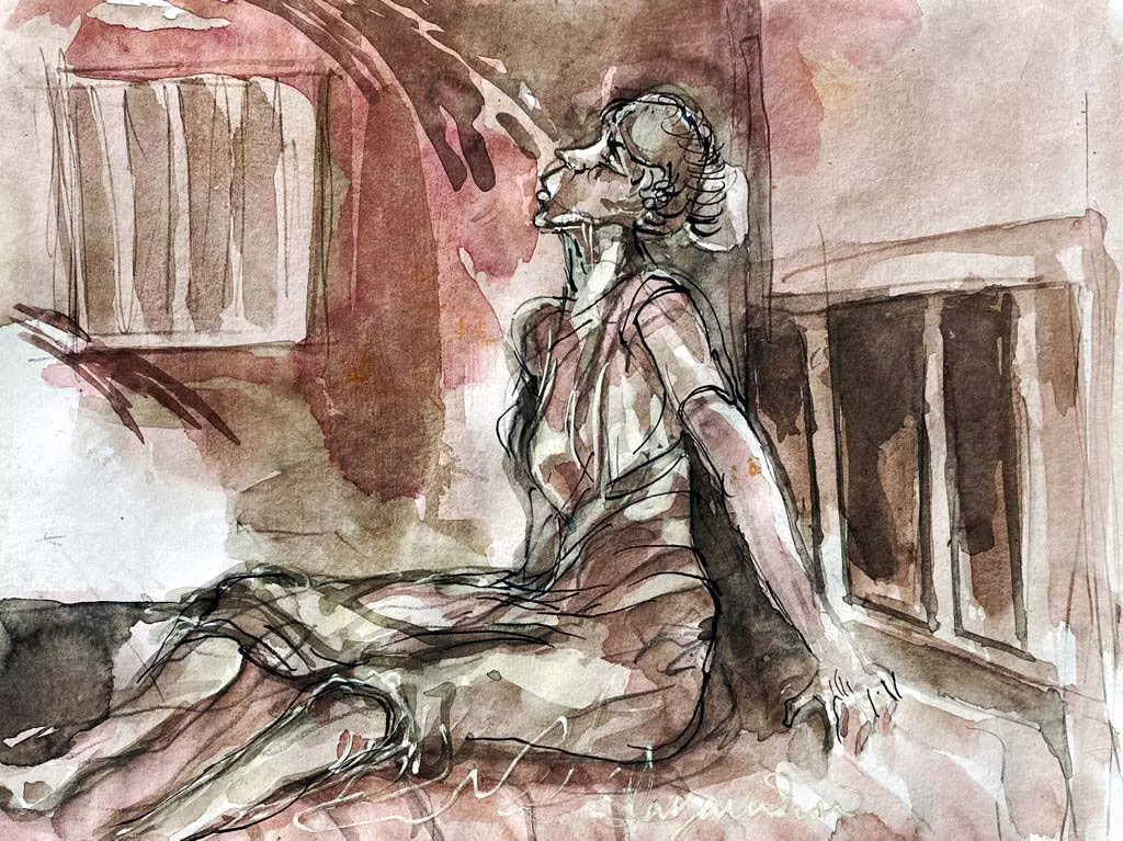 കൈകള് പിറകോട്ട് വെച്ച്. കാലുകള് കിടക്കയില് നീട്ടിവെച്ച്. തല മുകളിലേക്ക് ഉയര്ത്തിപ്പിടിച്ച്. കണ്ണുകള് രണ്ടും മുറുക്കെ അടച്ചുവെച്ച്.