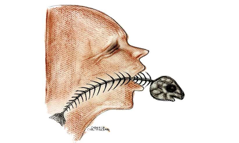 (തൊണ്ടയിൽ തടഞ്ഞത് തണ്ണീർമുക്കത്തെ ഫാമുകളിൽ വളരുന്ന ഗിഫറ്റ് തിലോപ്പിയയുടെ മുള്ളാണെങ്കിലും ഒരു ഗമക്കിരിക്കട്ടെ കരിമീനും അതിന്റെ മുള്ളും.)