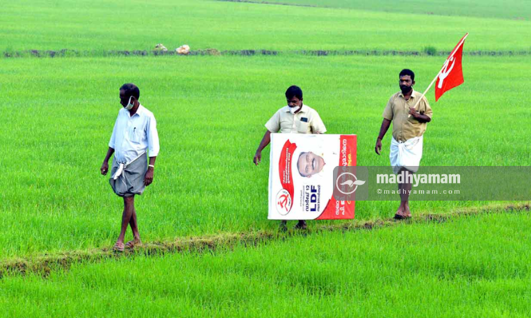 പള്ളാത്തുരുത്തി പാടശേഖരത്തിലൂടെ അവസാനഘട്ട പ്രചാരണത്തി​െൻറ ഭാഗമായി ബോർഡുകൾ സ്ഥാപിക്കാൻ എൽ.ഡി.എഫ്​ പ്രവർത്തകർ കാൽനടയായി പോകുന്നു