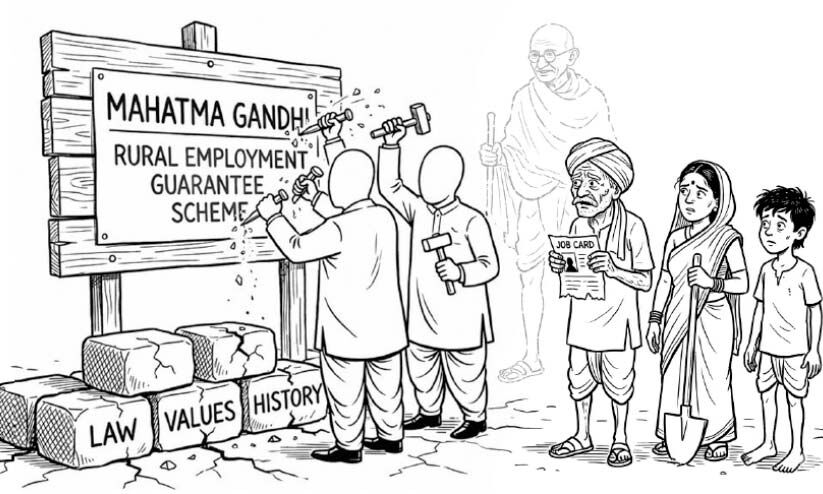 ഗാന്ധിയുടെ പേരിലും ആദർശങ്ങളിലും വ്യക്തമായി നങ്കൂരമിട്ടിരിക്കുന്ന ഒരു നിയമത്തെ തകർക്കാൻ ഒരു ഭരണകൂടവും ഒരുമ്പെടില്ല എന്നായിരുന്നു നാമെല്ലാം ധരിച്ചുവെച്ചിരുന്നത്. അദ്ദേഹത്തിന്റെ പേര് നീക്കം ചെയ്യുന്നതിലൂടെ, ഇന്ത്യയുടെ ഈ സുപ്രധാന തൊഴിൽ പദ്ധതിയെ അതിന്റെ ചരിത്രപരവും മൂല്യപരവുമായ അടിത്തറയിൽനിന്ന് വേർപെടുത്തുകയും, അത് കെട്ടിപ്പടുക്കപ്പെട്ട നിയമസാധുതയെ ദുർബലപ്പെടുത്തുകയുമാണ് ചെയ്യുന്നത്. അതിനൊപ്പം തന്നെ, ഗ്രാമീണ കുടുംബങ്ങളുടെ തൊഴിലുറപ്പിനെ വ്യവസ്ഥാപിതമായി ഇല്ലാതാക്കുന്ന നയപരമായ മാറ്റങ്ങളും നടപ്പിലാക്കുന്നുണ്ട്.