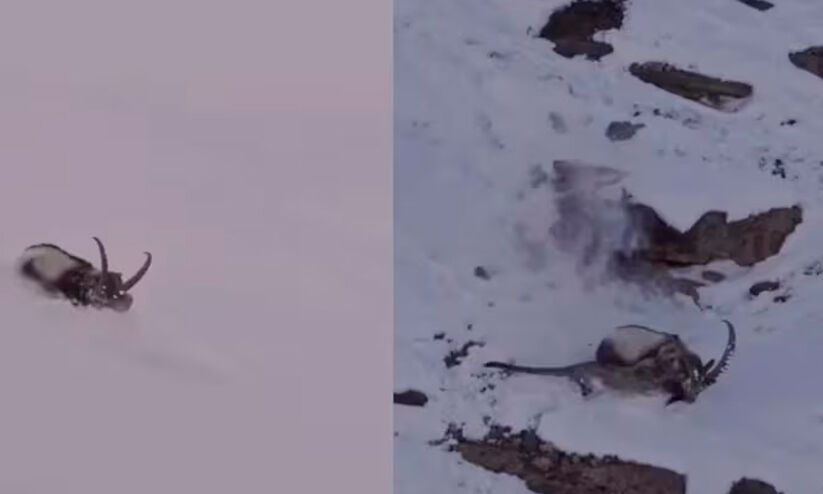 കൂറ്റൻ മലയാടിനെ വേട്ടയാടുന്ന ഹിമപ്പുലി; ലോകത്തിലെ ഏറ്റവും പ്രതികൂല ആവാസ വ്യവസ്ഥയിലെ അപൂർവ കാഴ്ച്ച; വിഡിയോ