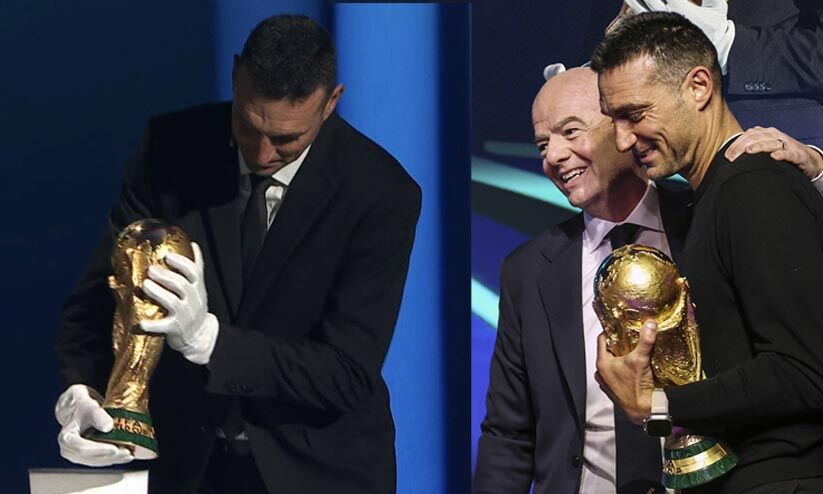 text_fieldsലയണൽ സ്കലോണി ഗ്ലൗസ് അണിഞ്ഞുകൊണ്ട് ലോകകപ്പ് ട്രോഫി എടുക്കുന്നു (ഇടത്), ഫിഫ ക്ഷമാപണം നടത്തിയതിനു പിന്നാലെ സ്കലോണി