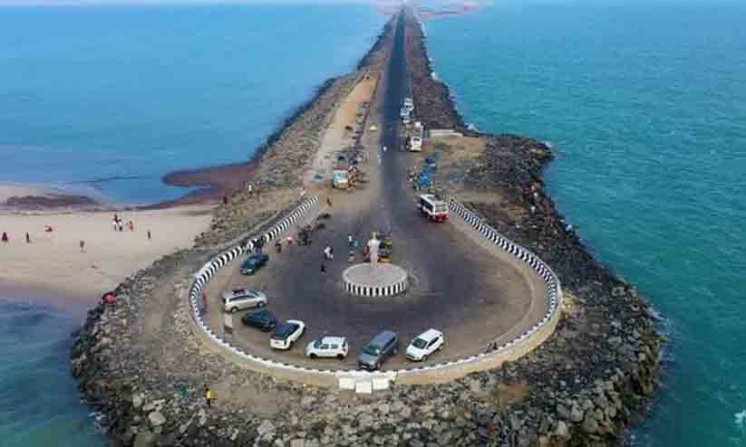 ശാന്തമായി കിടക്കുന്ന ബംഗാൾ ഉൾക്കടലിനും തിരകൾ ഒച്ചയുണ്ടാക്കുന്ന ഇന്ത്യൻ മഹാസമുദ്രത്തിനും നടുവിലൂടെ നേർരേഖപോലെ നീണ്ടുകിടക്കുന്ന പാത ചെന്നവസാനിക്കുന്നത് ഭൂമിയുടെ ഒരറ്റമായ ധനുഷ്കോടിയിലേക്കാണ്. ഇവിടെനിന്ന് ശ്രീലങ്കൻ തീരത്തേക്ക് കടൽമാർഗം 18 കിലോമീറ്ററിൽ താഴെ മാത്രം ദൂരം. പുരാണ കഥയിൽ സീതയെ വീണ്ടെടുക്കാൻ ഹനുമാന്റെ വാനര സൈന്യത്തോടൊപ്പം കടലിൽ ചിറകെട്ടി രാവണന്റെ സാമ്രാജ്യത്തിലോട്ട് ശ്രീരാമൻ കടന്നുചെന്നത് ഇവിടെ നിന്നുമാണ് എന്നാണ് വിശ്വാസം. ആകാശ കാഴ്ച്ചയിൽ രാമസേതു ഇന്നും തെളിഞ്ഞ് കാണാമത്രേ.