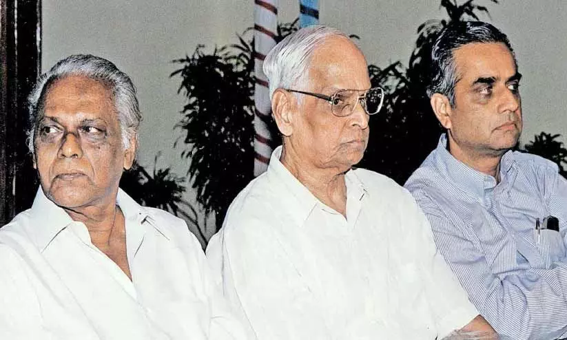 ദേവരാജൻ, പി. ഭാസ്കരൻ, കെ. ജയകുമാർ എന്നിവർ ഒരു പൊതു പരിപാടിക്കിടയിൽ