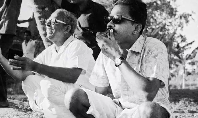 ഇരുട്ടിന്റെ ആത്മാവ് ഷൂട്ടിങ് വേളയിൽ പി. ഭാസ്കരനും എം.ടി. വാസുദേവൻ നായരും