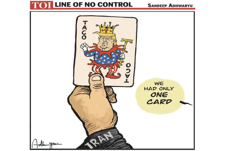 ഇപ്പോൾ ഇറാനെതിരെ ‘‘48 മണിക്കൂർ’’ ഭീഷണി മുഴക്കിയശേഷം ട്രംപ് പൊടുന്നനെ പിൻവാങ്ങുമ്പോൾ ‘ടാകോ’ വീണ്ടും തലക്കെട്ടുകളിലും കാർട്ടൂണുകളിലും ഇടംപിടിക്കുകയായി.