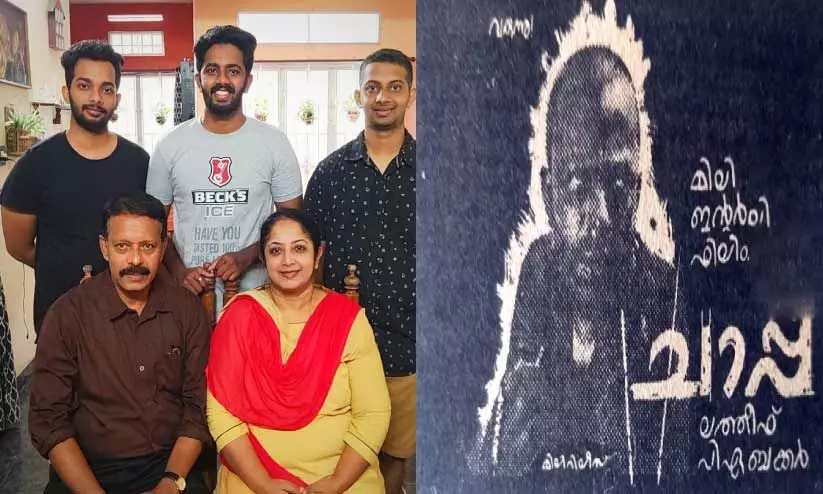 സാലു ജോർജ്, ഭാര്യ രേഖ, മക്കളായ എബി, ചെറി, ജോ എന്നിവർ,‘ചാപ്പ’ സിനിമയുടെ പോസ്റ്റർ