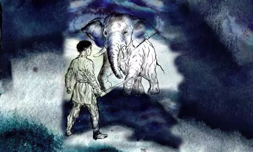 ലവലേശം ഭയമില്ലാതെ ഞാനെന്റെ കുതിരക്ക് സൂചന നൽകി. എന്നിൽ ഭയമുടലെടുത്താൽ എന്റെ കുതിരയുടെ ഭയം പതിന്മടങ്ങായി വർധിക്കും. കൈകാലുകളാൽ ഞാനെന്റെ സന്ദേശം കുതിരയെ അറിയിച്ചു. അവനത് മനസ്സിലാക്കി. എല്ലാം ക്ഷണനേരത്തില്. കയ്യിലിരുന്ന കുന്തം ആനയുടെ മസ്തകം ലക്ഷ്യമാക്കി ഞാനെറിഞ്ഞു. അപ്പോൾ ആന എന്റെ കുതിരയെ തന്റെ കൊമ്പുകൊണ്ട് ആക്രമിച്ചു. വളരെ കൃത്യസമയത്ത് കുതിരപ്പുറത്തുനിന്ന് ചാടി വാളെടുത്തുകൊണ്ട് ഞാൻ ആനയുടെ മുന്നിൽ നിന്നു. മസ്തകത്തില് തുളച്ചുകയറിയ കുന്തത്തിൽനിന്ന് രക്തം ഒലിച്ചിറങ്ങി. ആളുകളുടെ ആരവം എന്നെ ആവേശപ്പെടുത്തുന്ന ആര്പ്പുവിളിയായി ഞാന് കേട്ടു.