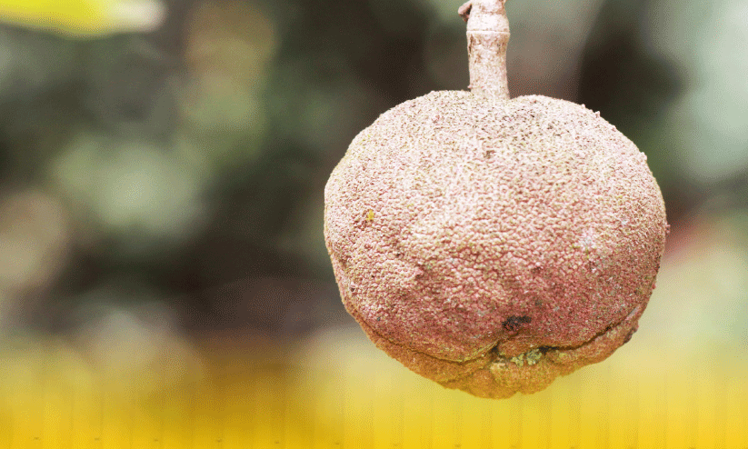 ഡിസംബർ-മാർച്ച് മാസങ്ങളിലാണ് പൂക്കുന്നത്. ശാഖകളിലാണ് പൂക്കൾ ഉണ്ടാകുന്നത്. ചെറിയ ഏകലിംഗപുഷ്പങ്ങൾക്ക് മഞ്ഞിച്ച പച്ചനിറമാണ്. അര സെന്റിമീറ്റർ വ്യാസം ഉണ്ടാകും. ദളങ്ങളും വിദളങ്ങളും അഞ്ചു വീതം. 5-15 കേസരങ്ങൾ കാണും. 5 -7 സെന്റിമീറ്റർ വ്യാസമുള്ള ഉരുണ്ട കായ്കൾക്ക് തവിട്ടുനിറമാണ്. പരുപരുത്തതും ചെറുമുഴകളുള്ളതുമായ കട്ടിയുള്ള തോടിനുള്ളിലായി കട്ടികൂടിയ മാംസളഭാഗങ്ങൾക്കിടയിലായി പത്തിരുപത് വിത്തുകളുണ്ടാകും. വിത്തുകൾക്ക് മഞ്ഞനിറമാണ്.